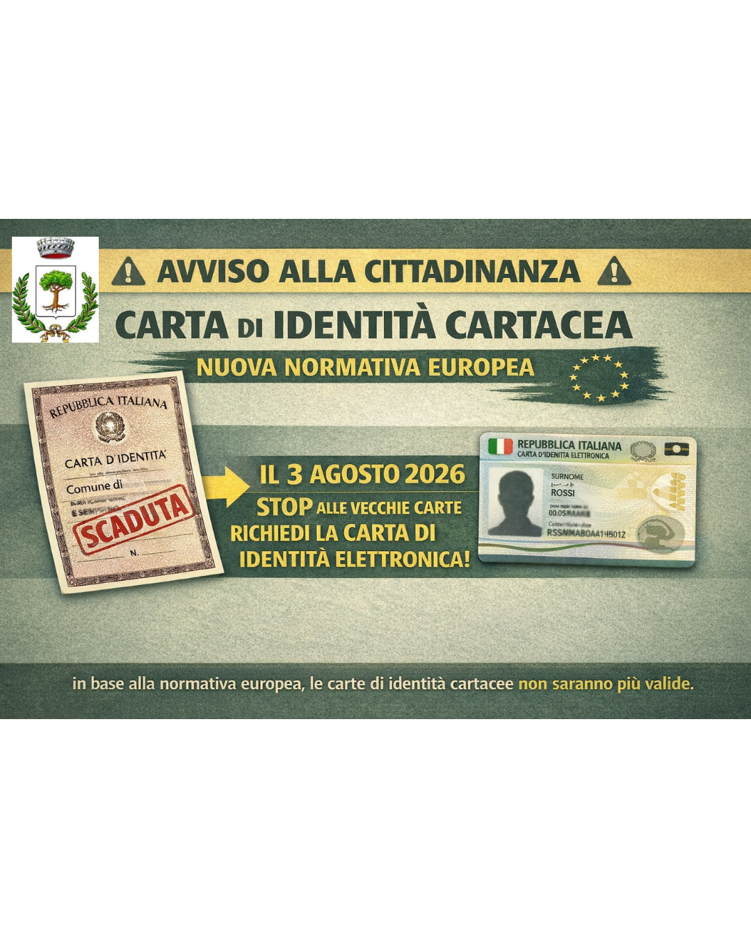 Dal 3 Agosto la carta di identità cartacea non sarà più valida. Dovrà essere sostituita, indipendentemente dalla scadenza, dalla CIE Carta Identità Elettronica.